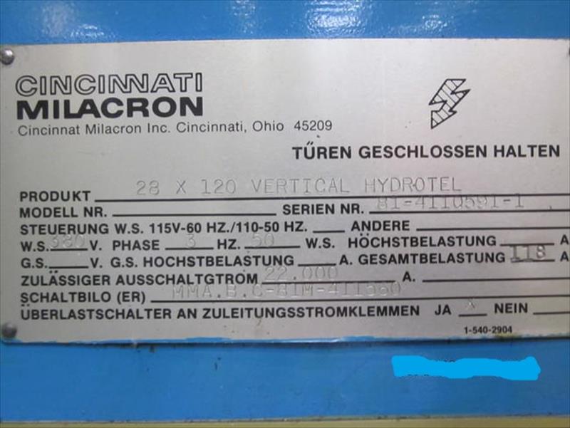 MAKİNE BİLGİLERİ Makine tipi 4-eksenli işleme merkezi Üretici Cincinnati Milacron ModellHydrotel 28 tam fonksiyonel bakımlı AÇIKLAMA seyahat: Boyuna (x): 3048mm Çapraz (Y): 762mm Yükseklik (Z): 356 mm Tablo: 648x3632mm Tutucu: 2080 SK50 DIN Hız: 1800U / dak Sürücü: 15KW Kontrol Acramatic MC Ekipman: Çok miktarda TAKIMLARIYLA Birlikte, BELGELER